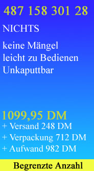 Dieses Vormschöne NICHTS, das von unseren besten Designern auf der ganzen Welt entwickelt wurde, kann NICHTS! Sie werden sehn, NICHTS erfüllt alle ihre Wünsche! Sie haben Lust auf NICHTS? Dann ist NICHTS genau das richtige für sie! Und wenn sie heute noch bestellen, erhalten sie DIES HIER gratis zum aufpreis von 548 DM gratis dazu! |